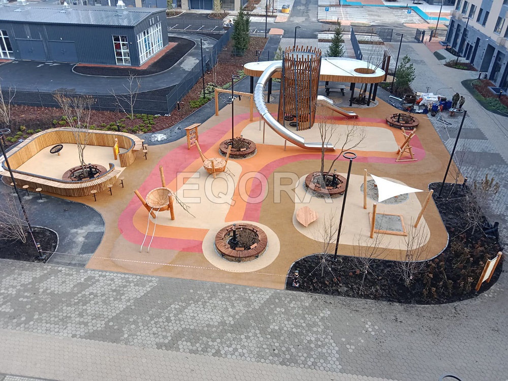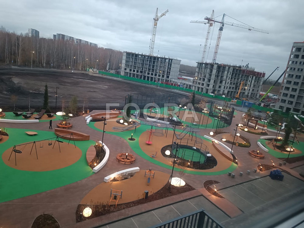 Устройство бесшовного покрытия из каучуковой EPDM крошки EQORA с амортизирующей подложкой толщина от 20 до100 мм Объект: ЖК «Мотивы» город Тюмень Площадь: 3500 м2